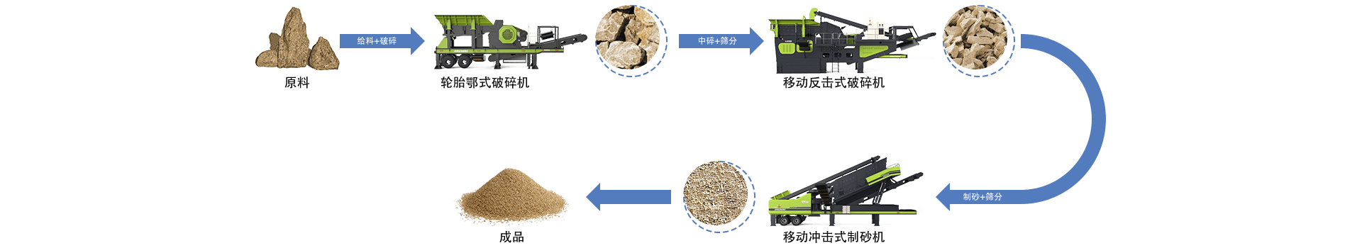 鄭州鼎盛移動(dòng)式生產(chǎn)線(xiàn)主要由輪胎式移動(dòng)破碎站、 輪胎式移動(dòng)篩分站等設備組成,專(zhuān)業(yè)的設備配型、合理的搭配,使得生產(chǎn)線(xiàn)自動(dòng)化程度高、生產(chǎn)效率大、運行成本低、收益高,且成品骨料粒度均勻、粒形好,符合高等級砂石骨料的生產(chǎn)要求。